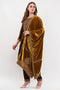 The Golden Velvet Suit Set with Pants & Dupatta features rich velvet fabric adorned with intricate coding embroidery work. This elegant set includes a matching dupatta, making it perfect for formal occasions or evening gatherings, offering a blend of luxury and sophistication. - Suit Pants, & Dupatta - Coding Embroidery work - Fabric- Velvet - Color- Golden - Sleeves- Full - Set of 3